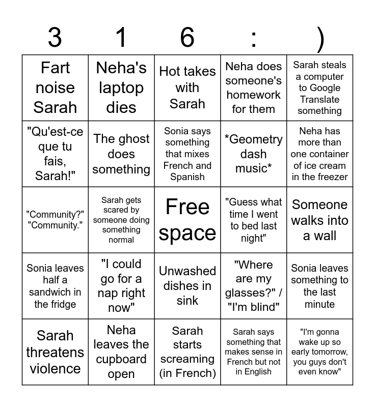 This bingo card has a free space and 24 words: "I could go for a nap right now", Neha leaves the cupboard open, Sonia says something that mixes French and Spanish, Sarah threatens violence, Sarah steals a computer to Google Translate something, Fart noise Sarah, "Qu'est-ce que tu fais, Sarah!", Neha's laptop dies, "Guess what time I went to bed last night", Unwashed dishes in sink, *Geometry dash music*, "Community?" "Community.", "Where are my glasses?" / "I'm blind", Sonia leaves something to the last minute, The ghost does something, Sarah says something that makes sense in French but not in English, Someone walks into a wall, Hot takes with Sarah, Neha has more than one container of ice cream in the freezer, Sarah gets scared by someone doing something normal, "I'm gonna wake up so early tomorrow, you guys don't even know", Sonia leaves half a sandwich in the fridge, Neha does someone's homework for them and Sarah starts screaming (in French).