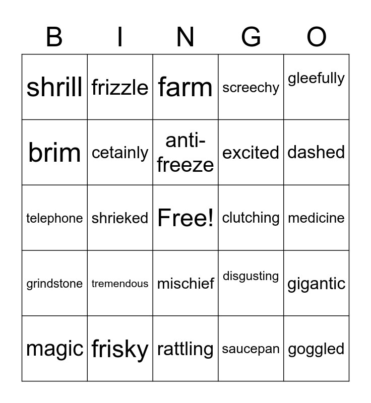 This bingo card has a free space and 24 words: tremendous, frisky, anti-freeze, magic, gleefully, shrill, brim, frizzle, clutching, mischief, excited, telephone, disgusting, gigantic, cetainly, saucepan, medicine, farm, dashed, shrieked, goggled, grindstone, screechy and rattling.