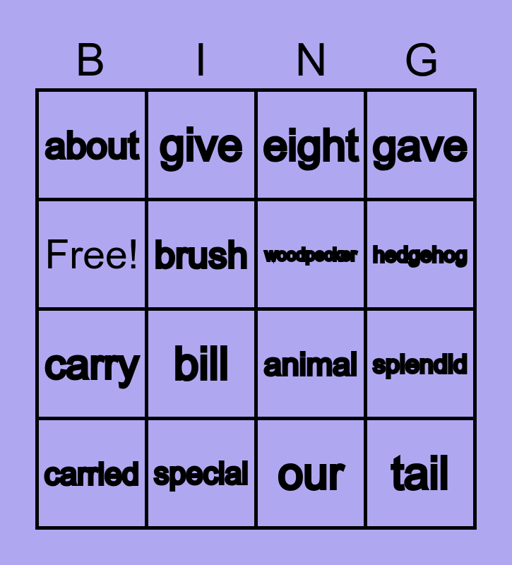 This bingo card has 16 words: special, splendid, eight, about, carry, give, animal, our, Free!, brush, carried, gave, bill, hedgehog, woodpecker and tail.