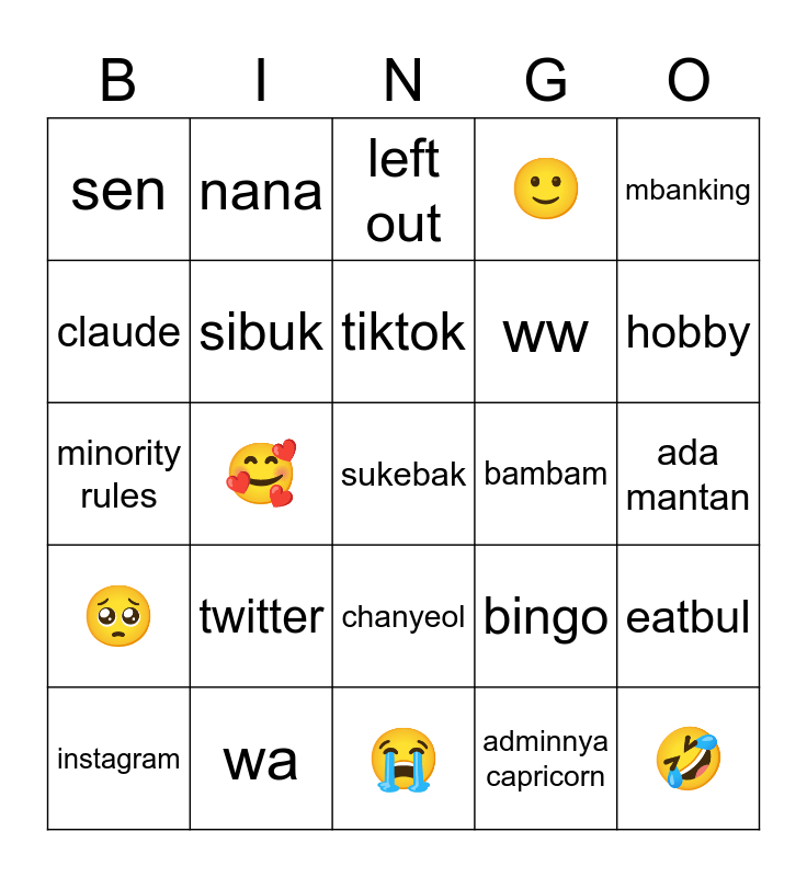 This bingo card has a free space and 24 words: twitter, wa, tiktok, instagram, mbanking, sen, claude, nana, bambam, chanyeol, ww, minority rules, bingo, eatbul, sibuk, adminnya capricorn, ada mantan, left out, hobby, 🥰, 🤣, 🥺, 🙂 and 😭.