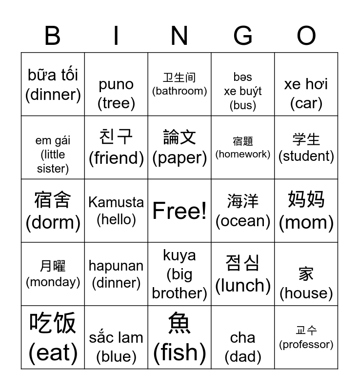 This bingo card has a free space and 29 words: 吃饭(eat), 학교(school), Kamusta (hello), 教室 (classroom), bữa tối (dinner), 卫生间(bathroom), 친구(friend), hapunan (dinner), 海洋 (ocean), sắc lam (blue), 妈妈 (mom), 교수(professor), 魚(fish), cha (dad), 学生(student), 개 (dog), kuya (big brother), 月曜 (monday), xe hơi (car), 宿舍(dorm), 점심 (lunch), libro (book), 宿題 (homework), em gái (little sister), bəs xe buýt (bus), puno (tree), 家 (house), 論文 (paper) and Tên (name).