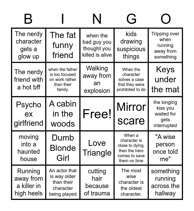 This bingo card has a free space and 24 words: Dumb Blonde Girl, An actor that is way older than their character being played, Walking away from an explosion, Running away from a killer in high heels, Tripping over when running away from something, The nerdy character gets a glow up, The nerdy friend with a hot bff, The fat funny friend, Mirror scare, Love Triangle, When the character solves a case that they were prohibited to do, Psycho ex girlfriend, When a character is close to dying, then the hero comes to save them on time, "A wise person once told me", when the father is too focused on work rather than their family., The most wise character is the oldest character., the longing kiss you waited for gets interrupted, when the bad guy you thought you killed is alive, Keys under the mat, A cabin in the woods, something running across the hallway, moving into a haunted house, kids drawing suspicious things and cutting hair because of trauma.