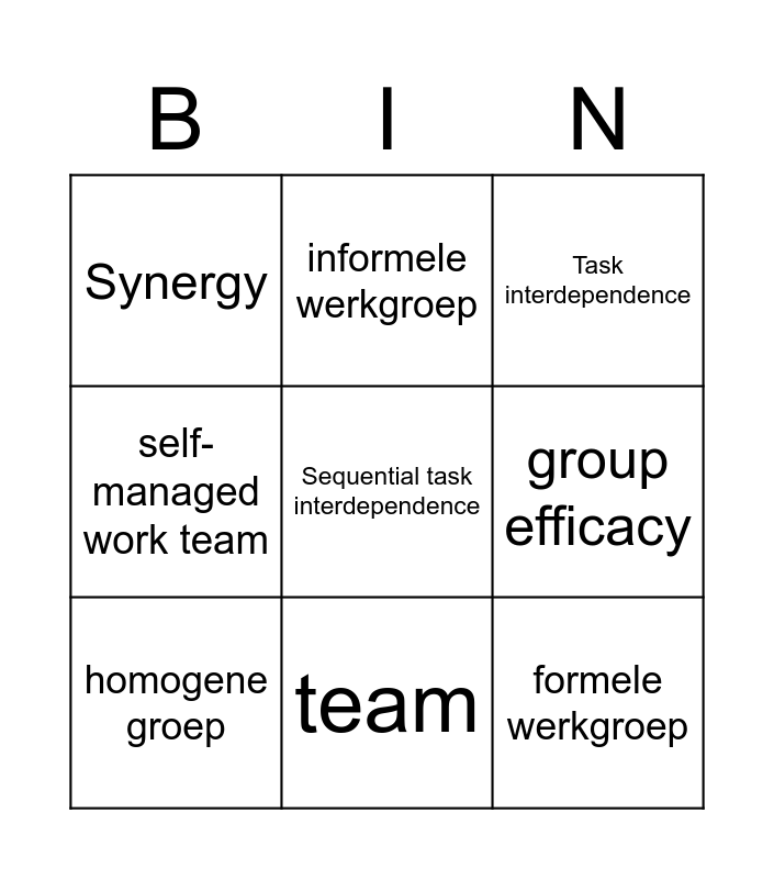 This bingo card has 19 words: Social loafing, Process losses, Task interdependence, Pooled task interdependence, werkgroep, Sequential task interdependence, Reciprocal task interdependence, Synergy, informele werkgroep, formele werkgroep, social facilitation, group efficacy, homogene groep, heterogene groep, task force, command group, self-managed work team, team and intrinsieke motivatie.