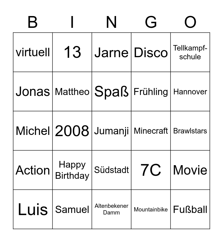 This bingo card has a free space and 24 words: Happy Birthday, Samuel, Spaß, Luis, Tellkampf-schule, virtuell, Jonas, 13, Minecraft, Südstadt, Frühling, Michel, 7C, Movie, Mattheo, Mountainbike, Brawlstars, Jarne, Hannover, 2008, Fußball, Action, Disco and Altenbekener Damm.
