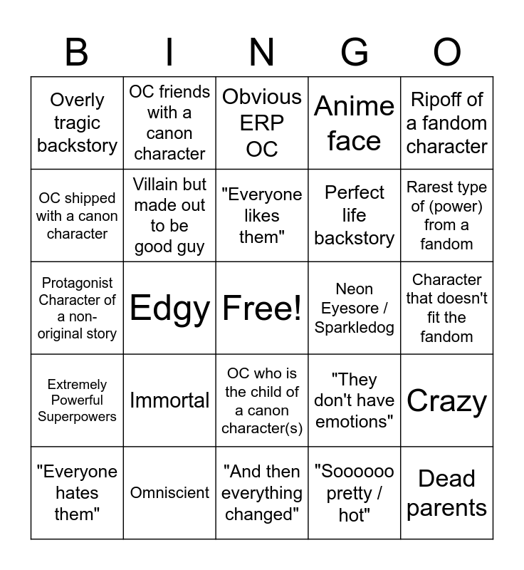 This bingo card has a free space and 24 words: Immortal, Omniscient, "Everyone likes them", "Everyone hates them", Ripoff of a fandom character, Overly tragic backstory, OC shipped with a canon character, OC friends with a canon character, Neon Eyesore / Sparkledog, OC who is the child of a canon character(s), Perfect life backstory, Protagonist Character of a non-original story, "They don't have emotions", Crazy, Villain but made out to be good guy, "Soooooo pretty / hot", Character that doesn't fit the fandom, Obvious ERP OC, Rarest type of (power) from a fandom, Edgy, Dead parents, Extremely Powerful Superpowers, Anime face and "And then everything changed".
