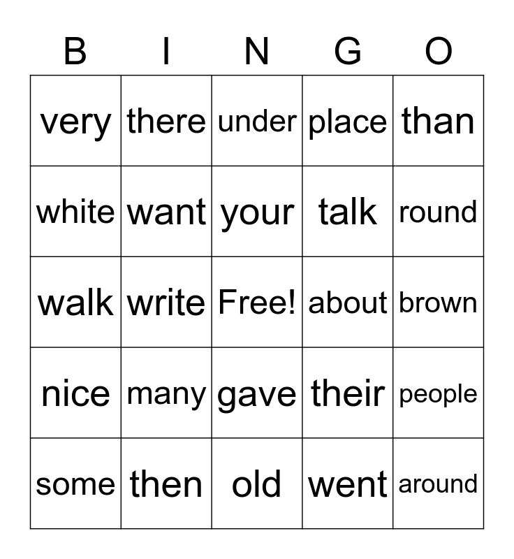 This bingo card has a free space and 24 words: many, then, your, some, than, very, white, there, about, gave, talk, walk, their, people, want, went, brown, under, round, write, around, nice, place and old.