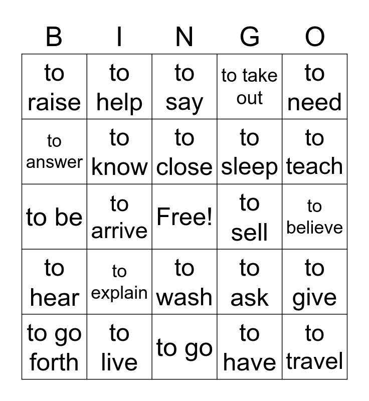 This bingo card has a free space and 24 words: to explain, to live, to close, to go forth, to need, to raise, to answer, to help, to sell, to wash, to sleep, to be, to ask, to give, to know, to have, to believe, to say, to teach, to arrive, to travel, to hear, to take out and to go.
