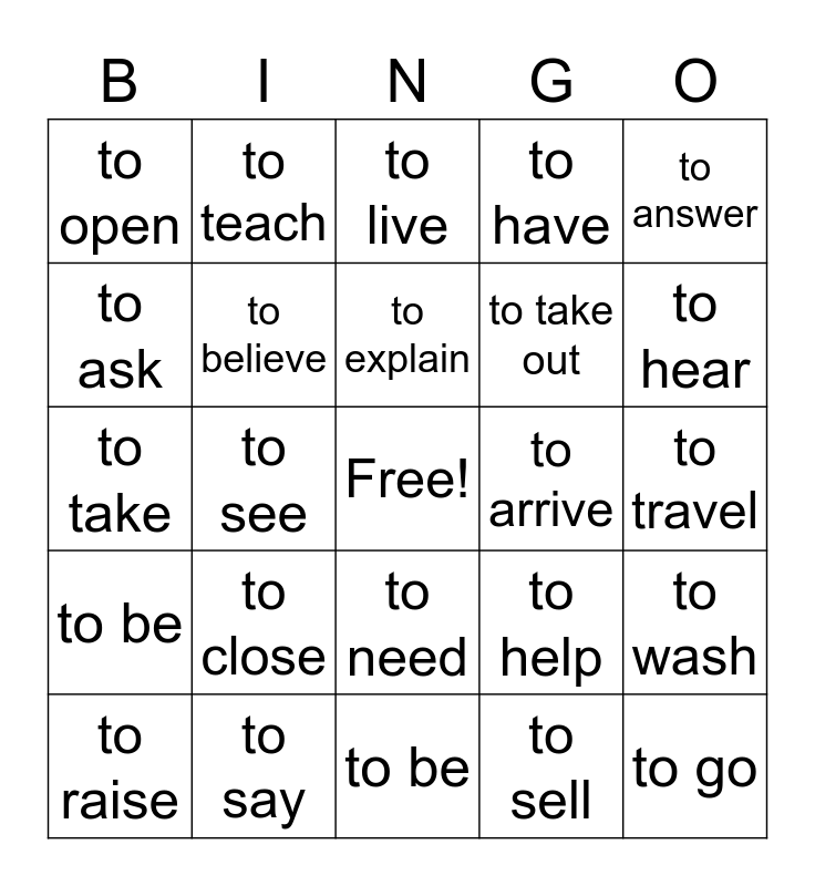 This bingo card has a free space and 24 words: to close, to say, to explain, to raise, to answer, to open, to ask, to teach, to arrive, to need, to take out, to take, to help, to wash, to believe, to sell, to travel, to live, to hear, to see, to go, to be, to have and to be.