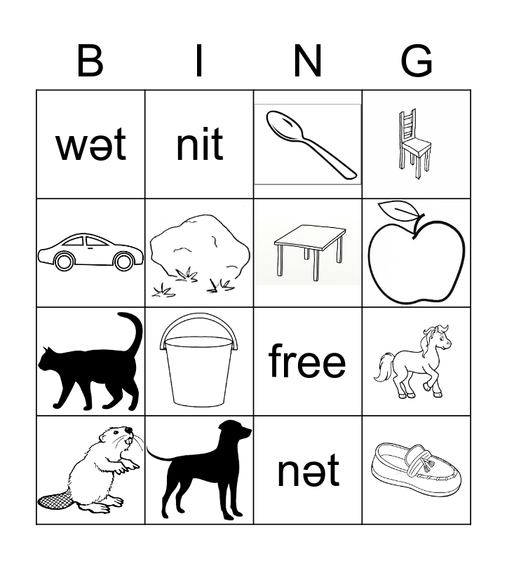 This bingo card has 12 images and 4 words: nit, free, wət and nət.