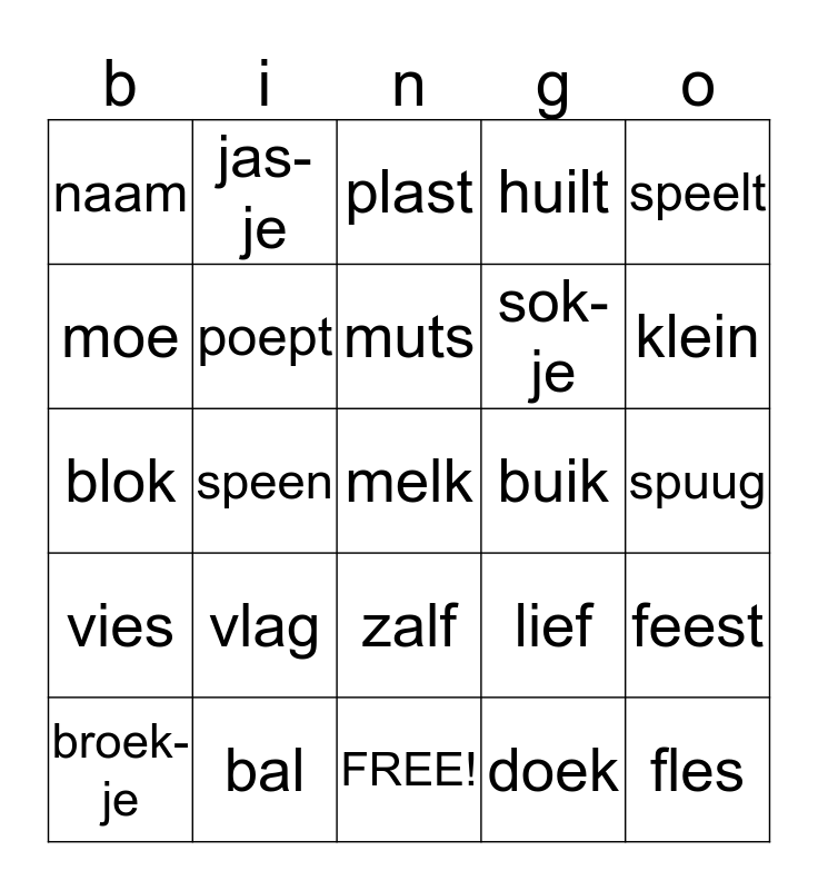 This bingo card has 31 words: FREE!, baby, speen, lui-er, naam, plast, poept, lief, buik, doek, spuug, melk, fles, slaapt, klein, kaart, feest, vlag, vies, zalf, speelt, rom-per, broek-je, jas-je, sok-je, moe, huilt, blok, bal, muts and ziek.