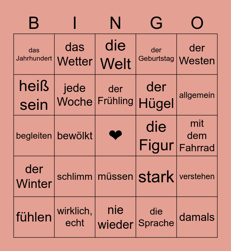 This bingo card has a free space and 24 words: schlimm, wirklich, echt, der Frühling, fühlen, der Westen, das Jahrhundert, heiß sein, das Wetter, die Figur, müssen, der Hügel, begleiten, stark, verstehen, jede Woche, die Sprache, mit dem Fahrrad, die Welt, allgemein, bewölkt, damals, der Winter, der Geburtstag and nie wieder.