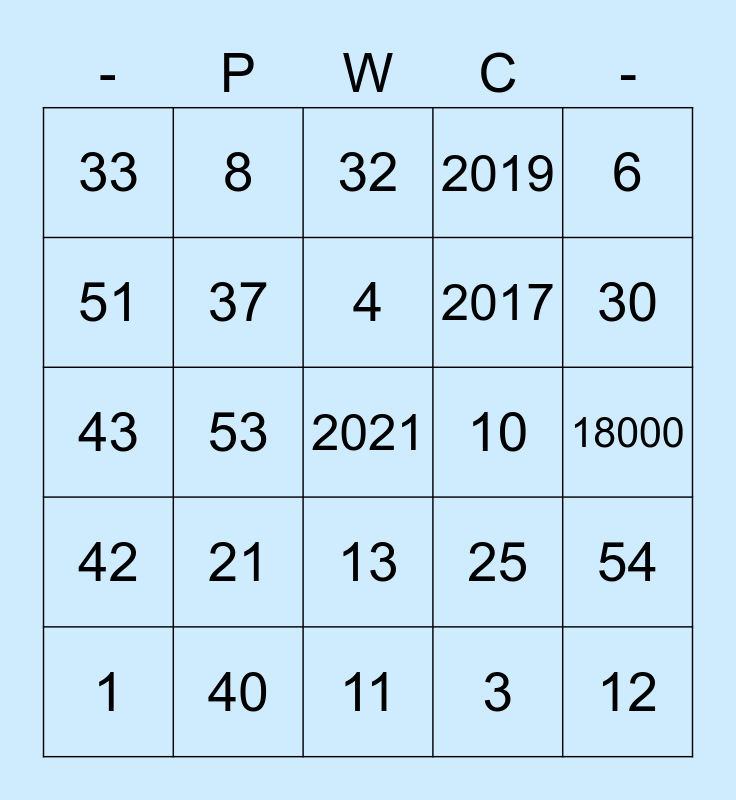 This bingo card has a free space and 34 words: 7, 3, 26, 45, 42, 37, 6, 1, 8, 5, 4, 32, 28, 2, 10, 30, 40, 43, 21, 25, 13, 14, 33, 18000, 11, 12, 2019, 2018, 2017, 51, 52, 53, 54 and 55.