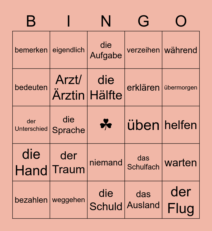 This bingo card has a free space and 24 words: der Traum, weggehen, die Hälfte, bezahlen, während, bemerken, bedeuten, eigendlich, üben, niemand, erklären, der Unterschied, das Schulfach, warten, Arzt/Ärztin, das Ausland, helfen, die Aufgabe, übermorgen, die Sprache, der Flug, die Hand, verzeihen and die Schuld.