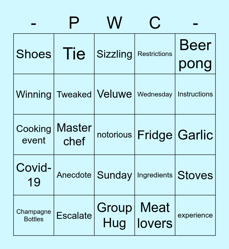 This bingo card has a free space and 24 words: Anecdote, Escalate, Veluwe, Champagne Bottles, Beer pong, Shoes, Winning, Tie, Fridge, Sunday, Wednesday, Cooking event, Ingredients, Stoves, Tweaked, Meat lovers, Garlic, Sizzling, Instructions, Master chef, experience, Covid-19, Restrictions and Group Hug.