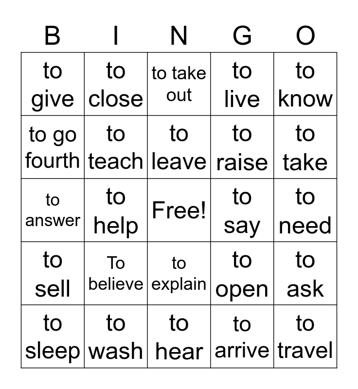This bingo card has a free space and 24 words: To believe, to wash, to leave, to sleep, to know, to give, to go fourth, to close, to say, to explain, to raise, to answer, to open, to ask, to teach, to arrive, to need, to take out, to take, to help, to travel, to sell, to live and to hear.
