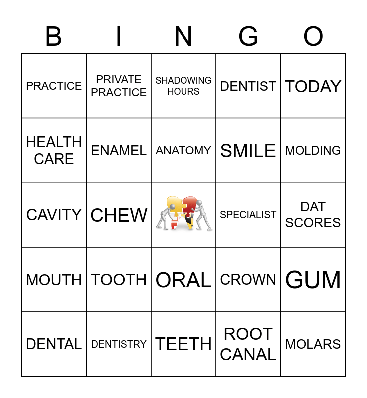 This bingo card has a free space and 24 words: TOOTH, DENTISTRY, ANATOMY, DENTAL, TODAY, PRACTICE, HEALTH CARE, PRIVATE PRACTICE, SPECIALIST, ORAL, SMILE, CAVITY, CROWN, GUM, ENAMEL, ROOT CANAL, DAT SCORES, SHADOWING HOURS, MOLDING, CHEW, MOLARS, MOUTH, DENTIST and TEETH.