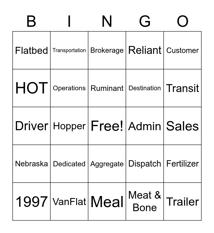 This bingo card has a free space and 29 words: 1997, Lincoln, Hopper, Van, Flatbed, Brokerage, Operations, Dedicated, Admin, VanFlat, Sales, Trailer, Meal, Meat & Bone, Transit, Grain, Aggregate, Nebraska, Customer, Driver, Dispatch, Origin, Destination, HOT, Reliant, Transportation, Fertilizer, Ruminant and Fox.