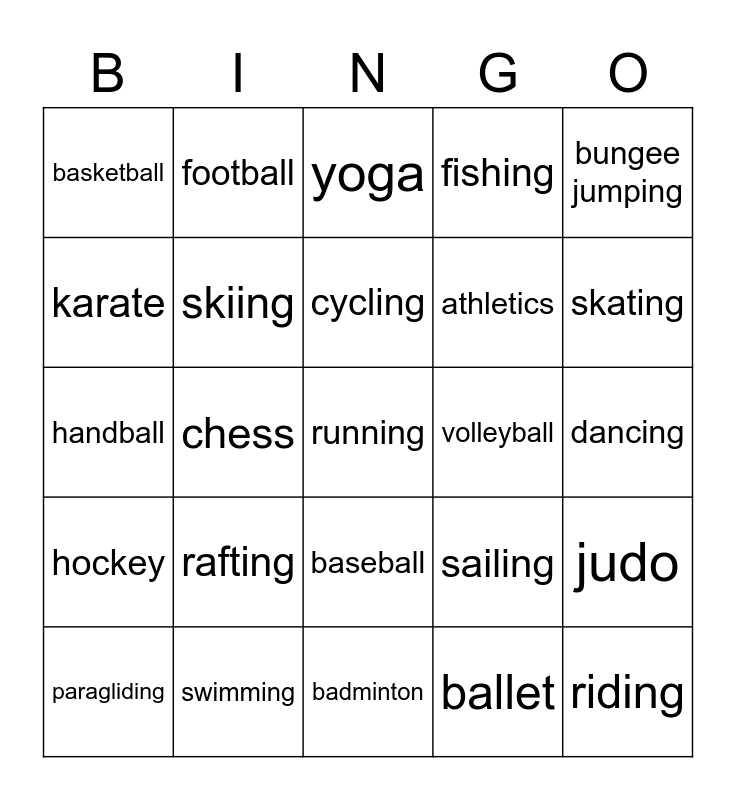 This bingo card has a free space and 24 words: rafting, swimming, cycling, paragliding, bungee jumping, basketball, karate, football, volleyball, baseball, athletics, handball, sailing, judo, skiing, ballet, dancing, yoga, skating, chess, riding, hockey, fishing and badminton.