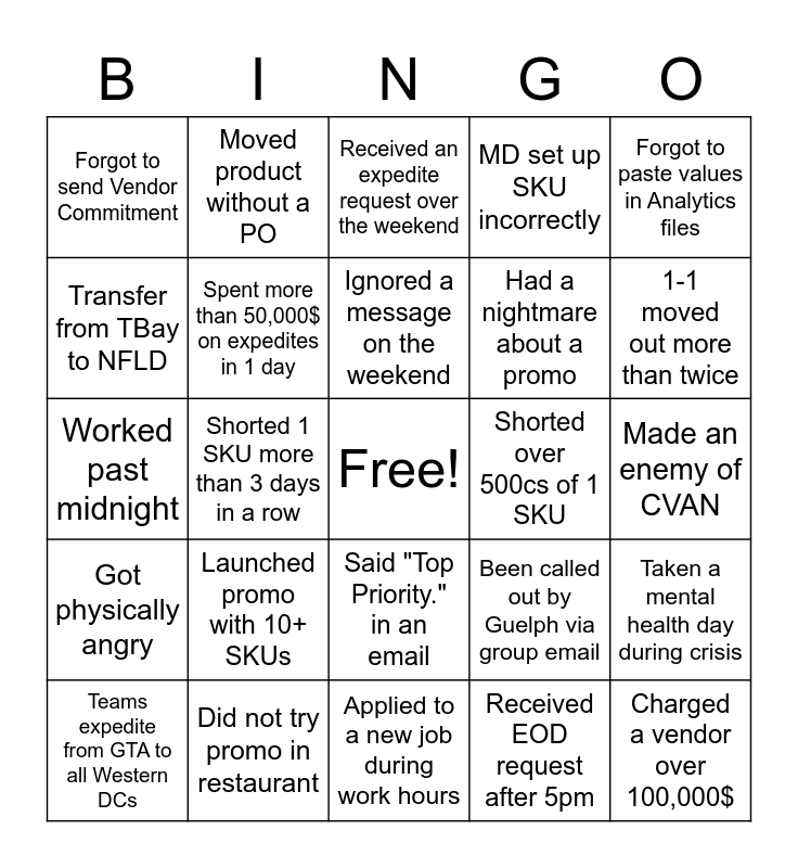 This bingo card has a free space and 29 words: Teams expedite from GTA to all Western DCs, Launched promo with less than 2 weeks of planning time, Shorted 1 SKU more than 3 days in a row, Sent over 5+ Promo Com revisions, Forgot to send Vendor Commitment, Received an expedite request over the weekend, Spent more than 50,000$ on expedites in 1 day, Launched promo with 10+ SKUs, Shorted over 500cs of 1 SKU, Did not try promo in restaurant, Made an enemy of CVAN, Charged a vendor over 100,000$, Applied to a new job during work hours, Received EOD request after 5pm, 1-1 moved out more than twice, Forgot to add drop ship to WMS, Said "Top Priority." in an email, Got physically angry, Forgot to paste values in Analytics files, Worked past midnight, Been called out by Guelph via group email, Arranged 10+ expedites in 1 day, Had a nightmare about a promo, Transfer from TBay to NFLD, MD set up SKU incorrectly, Moved product without a PO, Taken a mental health day during crisis, Ignored a message on the weekend and Launched promo worth over 10$M.