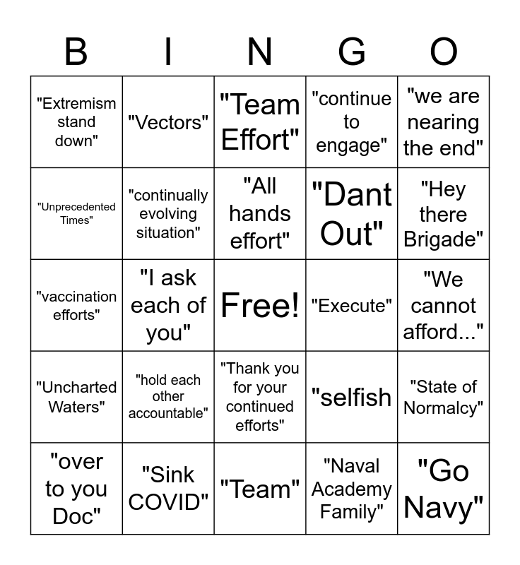 This bingo card has a free space and 24 words: "hold each other accountable", "Sink COVID", "All hands effort", "over to you Doc", "we are nearing the end", "Extremism stand down", "Unprecedented Times", "Vectors", "Execute", "Thank you for your continued efforts", "Dant Out", "vaccination efforts", "selfish, "State of Normalcy", "continually evolving situation", "Naval Academy Family", "We cannot afford...", "Team Effort", "Hey there Brigade", "I ask each of you", "Go Navy", "Uncharted Waters", "continue to engage" and "Team".