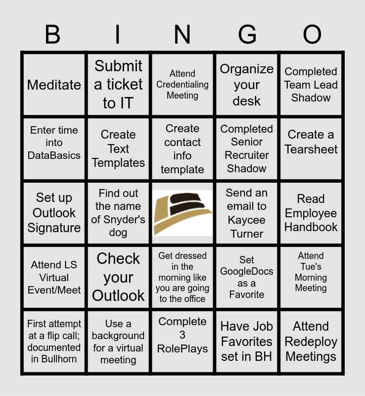 This bingo card has a free space and 24 words: Check your Outlook, Use a background for a virtual meeting, Create contact info template, First attempt at a flip call; documented in Bullhorn, Completed Team Lead Shadow, Meditate, Enter time into DataBasics, Submit a ticket to IT, Send an email to Kaycee Turner, Get dressed in the morning like you are going to the office, Completed Senior Recruiter Shadow, Set up Outlook Signature, Set GoogleDocs as a Favorite, Attend Tue's Morning Meeting, Create Text Templates, Have Job Favorites set in BH, Read Employee Handbook, Attend Credentialing Meeting, Create a Tearsheet, Find out the name of Snyder's dog, Attend Redeploy Meetings, Attend LS Virtual Event/Meet, Organize your desk and Complete 3 RolePlays.