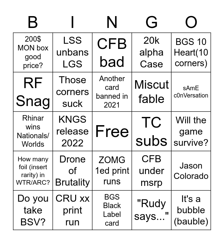 This bingo card has a free space and 24 words: Do you take BSV?, Drone of Brutality, Another card banned in 2021, "Rudy says...", BGS 10 Heart(10 corners), 200$ MON box good price?, LSS unbans LGS, CFB bad, TC subs, Will the game survive?, Rhinar wins Nationals/ Worlds, Those corners suck, CFB under msrp, Jason Colorado, RF Snag, CRU xx print run, BGS Black Label card, 20k alpha Case, sAmE c0nVersation, How many foil (insert rarity) in WTR/ARC?, KNGS release 2022, ZOMG 1ed print runs, Miscut fable and It's a bubble (bauble).