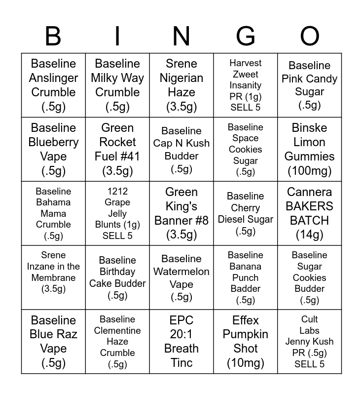 This bingo card has a free space and 24 words: Baseline Birthday Cake Budder (.5g), Baseline Clementine Haze Crumble (.5g), Baseline Cap N Kush Budder (.5g), Baseline Blue Raz Vape (.5g), Baseline Pink Candy Sugar (.5g), Baseline Anslinger Crumble (.5g), Baseline Blueberry Vape (.5g), Baseline Milky Way Crumble (.5g), Baseline Cherry Diesel Sugar (.5g), Baseline Watermelon Vape (.5g), Baseline Space Cookies Sugar (.5g), Baseline Bahama Mama Crumble (.5g), Baseline Banana Punch Badder (.5g), Baseline Sugar Cookies Budder (.5g), Green Rocket Fuel #41 (3.5g), Effex Pumpkin Shot (10mg), Cannera BAKERS BATCH (14g), Srene Nigerian Haze (3.5g), Binske Limon Gummies (100mg), 1212 Grape Jelly Blunts (1g) SELL 5, Cult Labs Jenny Kush PR (.5g) SELL 5, Srene Inzane in the Membrane (3.5g), Harvest Zweet Insanity PR (1g) SELL 5 and EPC 20:1 Breath Tinc.
