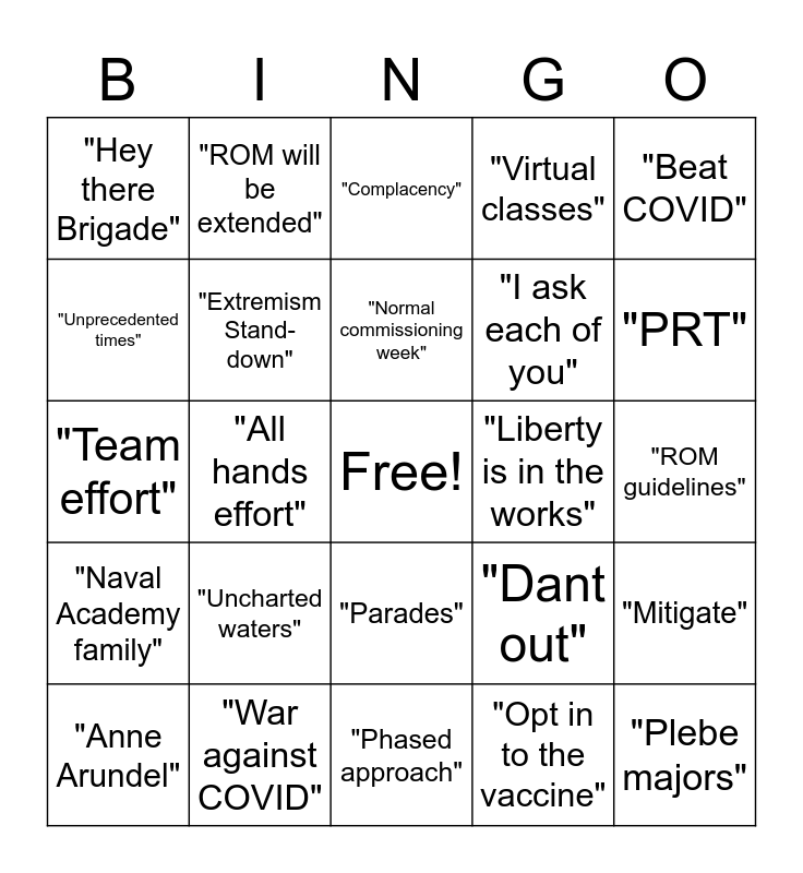 This bingo card has a free space and 24 words: "Uncharted waters", "War against COVID", "Normal commissioning week", "Anne Arundel", "Beat COVID", "Hey there Brigade", "Unprecedented times", "ROM will be extended", "Liberty is in the works", "Parades", "I ask each of you", "Team effort", "Dant out", "Mitigate", "Extremism Stand-down", "Opt in to the vaccine", "ROM guidelines", "Complacency", "PRT", "All hands effort", "Plebe majors", "Naval Academy family", "Virtual classes" and "Phased approach".