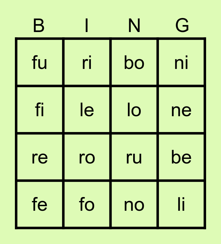 This bingo card has 20 words: be, bi, bo, bu, fe, fi, fo, fu, re, ri, ro, ru, le, li, lo, lu, ne, ni, no and nu.