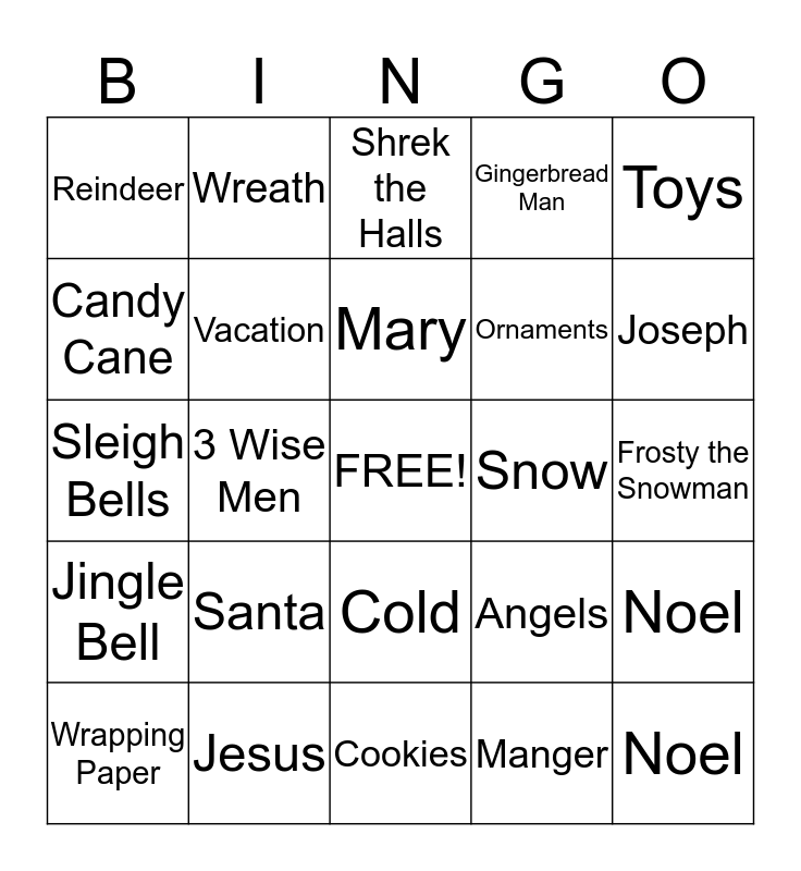 This bingo card has a free space and 24 words: Santa, Jesus, Mary, Wrapping Paper, Toys, Reindeer, Candy Cane, Wreath, Snow, Cold, Ornaments, Sleigh Bells, Angels, Noel, Vacation, Manger, Frosty the Snowman, Shrek the Halls, Joseph, 3 Wise Men, Noel, Jingle Bell, Gingerbread Man and Cookies.
