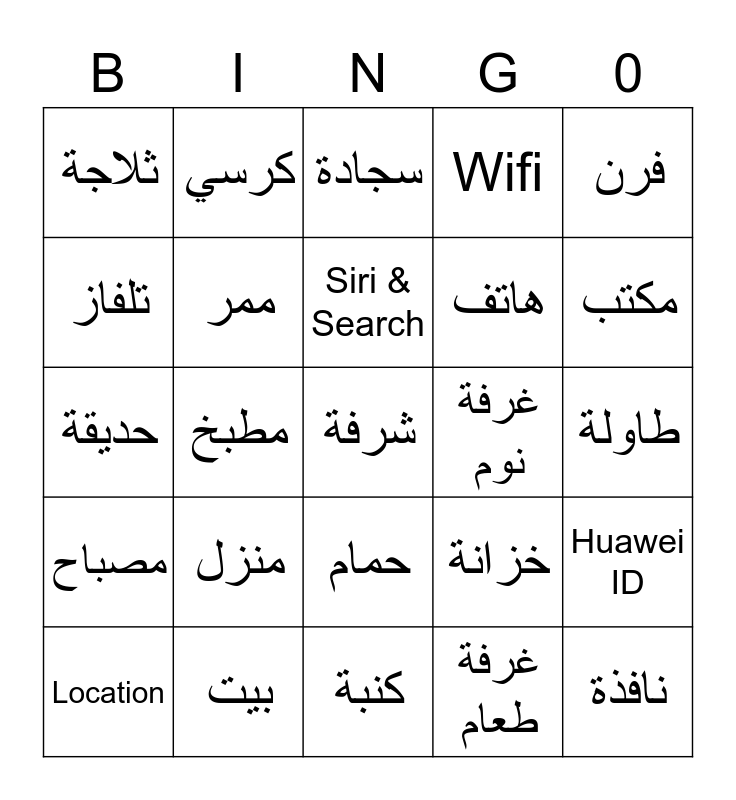 This bingo card has 30 words: بيت, غرفة جلوس, مطبخ, باب, ثلاجة, سجادة, ممر, حمام, غرفة نوم, كنبة, طاولة, شرفة, غرفة طعام, نافذة, مكتب, جراج, خزانة, مصباح, منزل, فرن, حديقة, سرير, كرسي, هاتف, تلفاز, Wifi, Huawei ID, Location, Siri & Search and Bluetooth.
