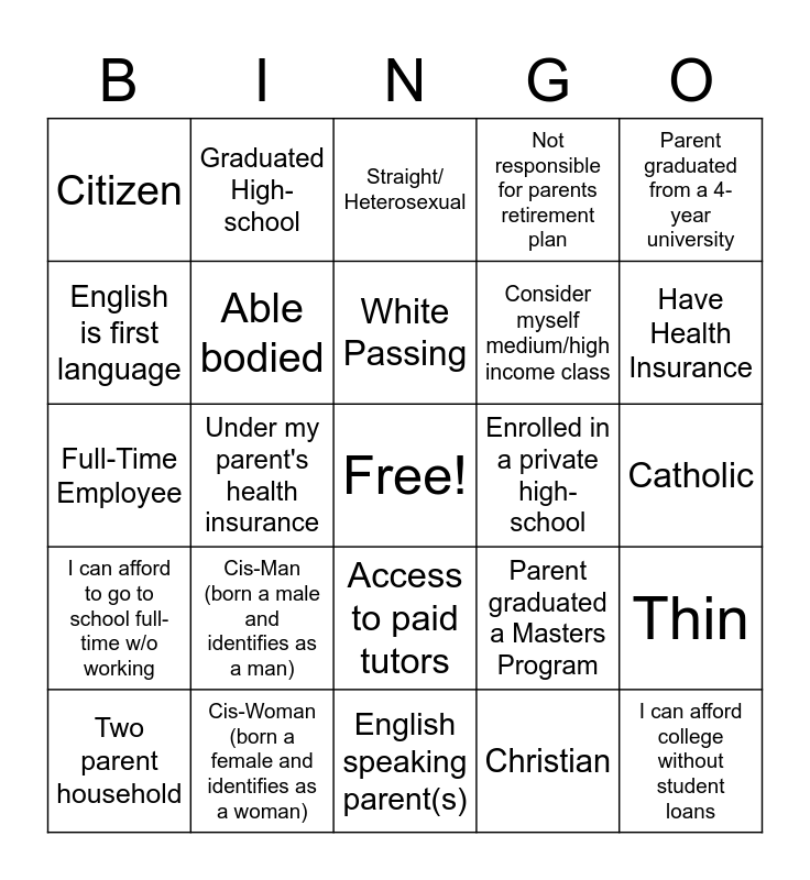 This bingo card has a free space and 24 words: Cis-Man (born a male and identifies as a man), Cis-Woman (born a female and identifies as a woman), White Passing, Two parent household, Parent graduated from a 4-year university, Citizen, English is first language, Graduated High-school, Enrolled in a private high-school, Access to paid tutors, Consider myself medium/high income class, Full-Time Employee, Parent graduated a Masters Program, Thin, Able bodied, Christian, Catholic, Straight/ Heterosexual, Have Health Insurance, Under my parent's health insurance, I can afford college without student loans, I can afford to go to school full-time w/o working, Not responsible for parents retirement plan and English speaking parent(s).
