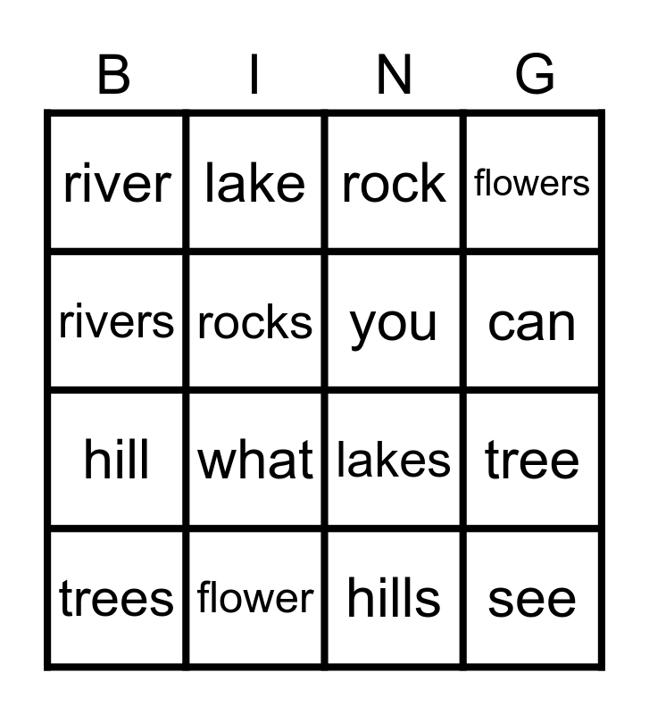 This bingo card has 16 words: flower, tree, rock, river, hill, lake, lakes, hills, rivers, rocks, trees, flowers, what, can, you and see.