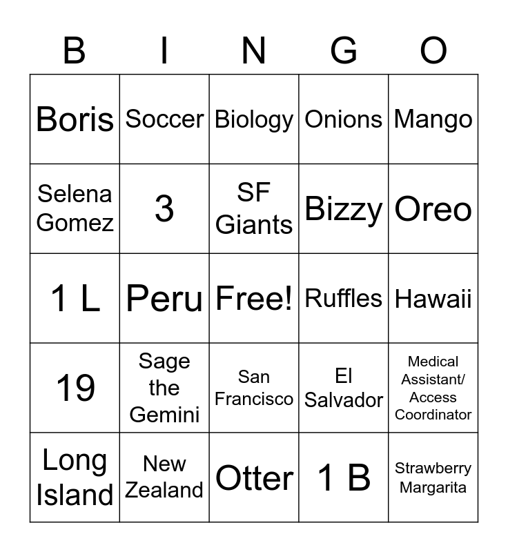This bingo card has a free space and 29 words: Long Island, Blue, Peru, Harry Potter, Boris, Biology, 3, Sage the Gemini, Ruffles, New Zealand, Hawaii, Strawberry Margarita, Otter, 1 B, Oreo, Lewis & Clark College, San Francisco, 19, Mango, 1 L, El Salvador, Physician, Bizzy, Selena Gomez, Onions, Soccer, Medical Assistant/ Access Coordinator, SF Giants and Christmas.