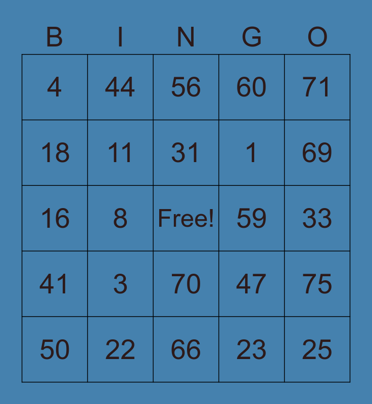 This bingo card has a free space and 24 words: 3, 22, 31, 50, 71, 4, 18, 44, 59, 70, 1, 16, 47, 75, 11, 23, 33, 56, 69, 8, 25, 41, 60 and 66.