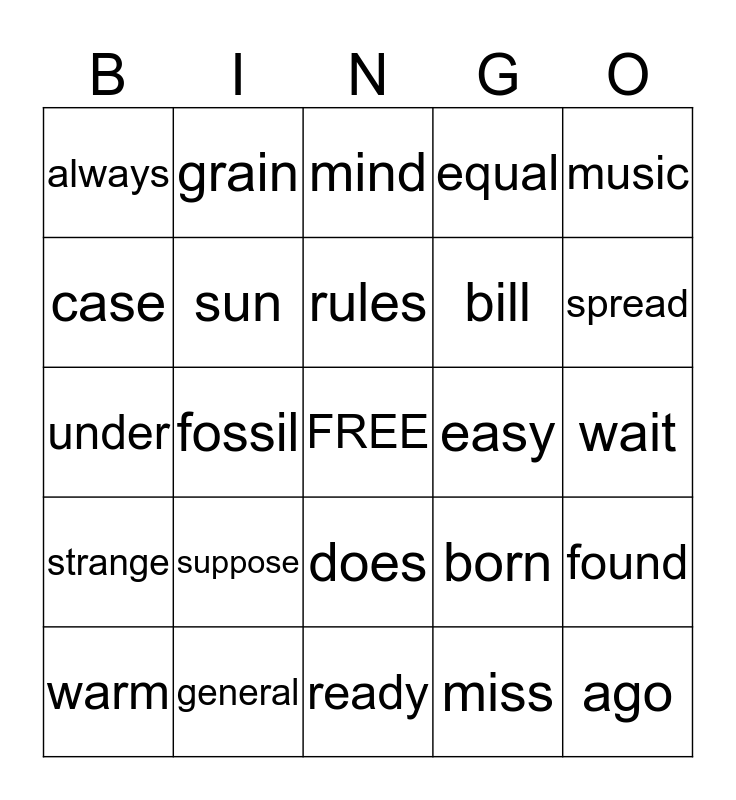 This bingo card has a free space and 24 words: suppose, general, rules, warm, music, always, case, grain, easy, does, bill, under, born, found, sun, miss, wait, mind, spread, fossil, ago, strange, equal and ready.