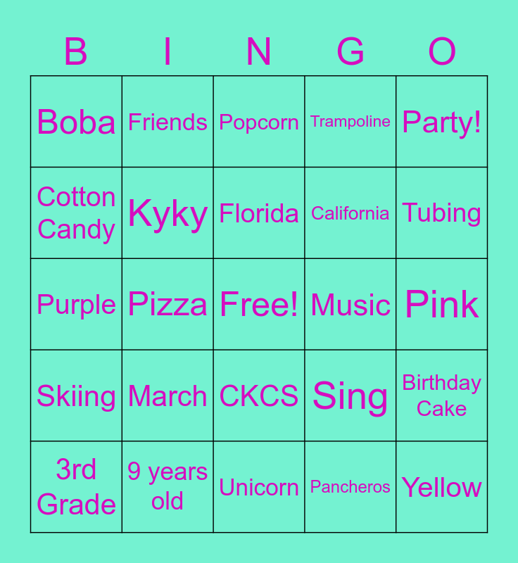 This bingo card has a free space and 54 words: Marshy, March, Jack, Teal, Pink, Strawberry, Kyky, ice cream, Trampoline, Horseback Riding, Boba, Sushi, Pancheros, Birthday Cake, Swimming, Traveling, Florida, California, Wisconsin Dells, 3rd Grade, 9 years old, Unicorn, Music, Party!, Family, Friends, CKCS, Spring, Candy, Dogs, Cats, Horses, Hamsters, Fish, Cotton Candy, Mint Chocolate Chip, Popcorn, Sing, Yellow, Purple, Sprinkles, Confetti, Glitter, Sparkles, Roblox, Minecraft, Starbucks, Uno, Tubing, Skiing, Pizza, Hawaii, Arizona and Llamas.