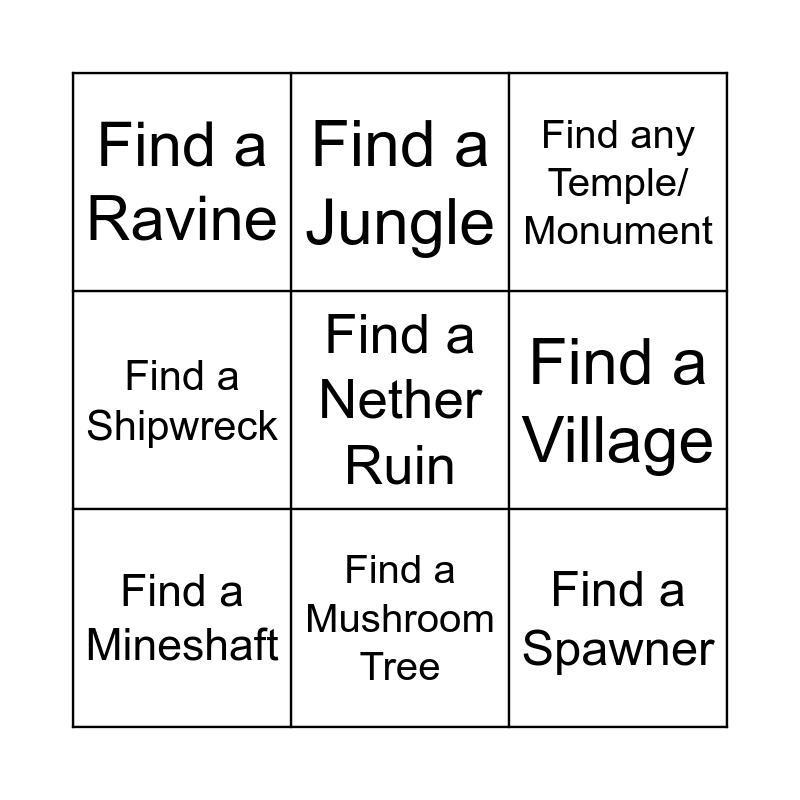 This bingo card has a free space and 8 words: Find a Village, Find any Temple/ Monument, Find a Jungle, Find a Mineshaft, Find a Ravine, Find a Spawner, Find a Shipwreck and Find a Mushroom Tree.