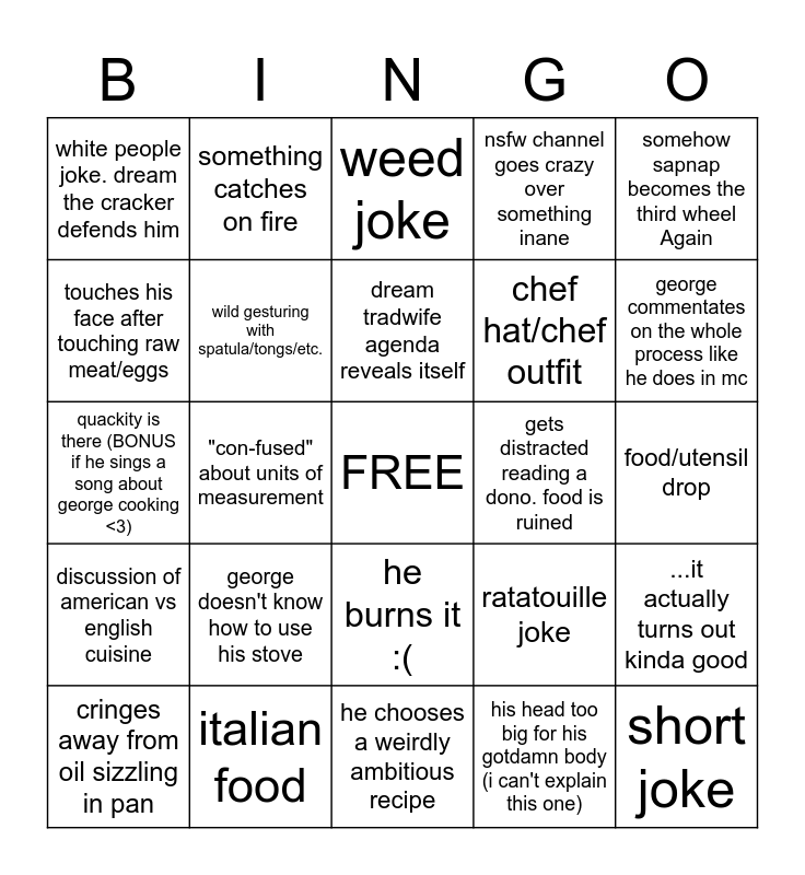 This bingo card has a free space and 24 words: george doesn't know how to use his stove, italian food, dream tradwife agenda reveals itself, cringes away from oil sizzling in pan, somehow sapnap becomes the third wheel Again, white people joke. dream the cracker defends him, touches his face after touching raw meat/eggs, something catches on fire, gets distracted reading a dono. food is ruined, he burns it :(, chef hat/chef outfit, quackity is there (BONUS if he sings a song about george cooking <3), ratatouille joke, ...it actually turns out kinda good, wild gesturing with spatula/tongs/etc., his head too big for his gotdamn body (i can't explain this one), food/utensil drop, weed joke, george commentates on the whole process like he does in mc, "con-fused" about units of measurement, short joke, discussion of american vs english cuisine, nsfw channel goes crazy over something inane and he chooses a weirdly ambitious recipe.