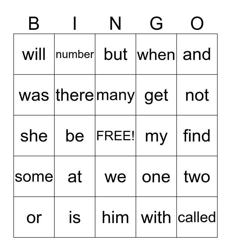 This bingo card has a free space and 24 words: at, is, many, or, and, will, was, number, my, we, get, she, one, two, there, with, find, but, not, be, called, some, when and him.