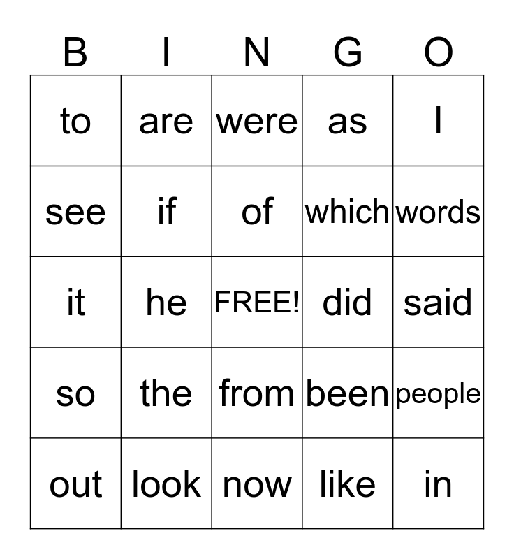 This bingo card has a free space and 24 words: the, look, of, out, I, to, see, are, did, from, which, it, been, people, if, like, said, were, words, he, in, so, as and now.