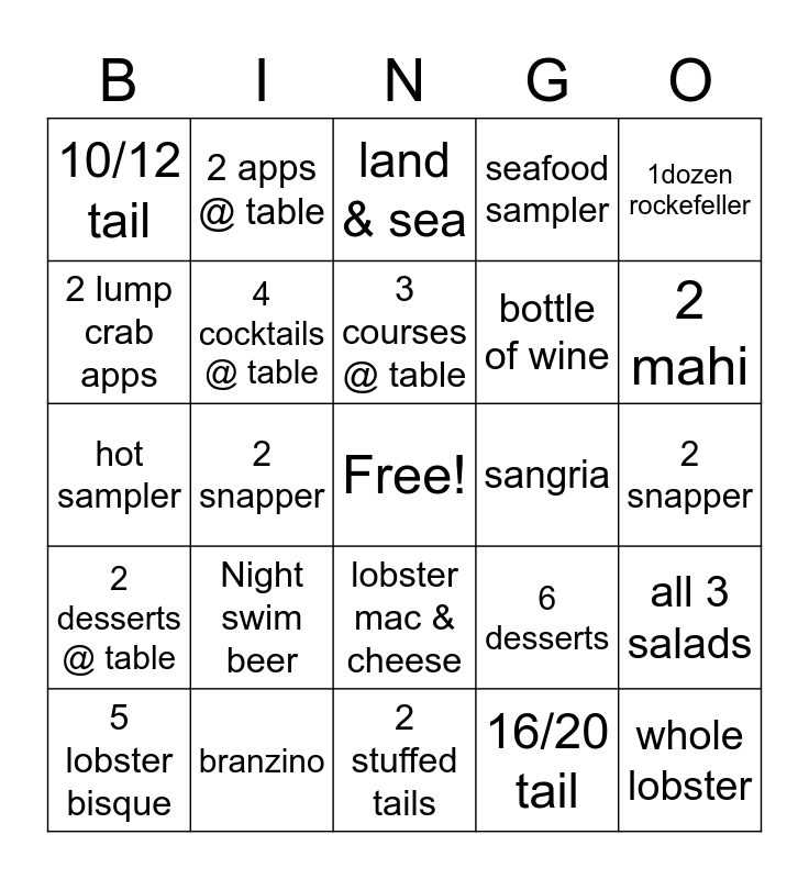 This bingo card has a free space and 24 words: Night swim beer, branzino, 3 courses @ table, 5 lobster bisque, 1dozen rockefeller, 10/12 tail, 2 lump crab apps, 2 apps @ table, sangria, lobster mac & cheese, bottle of wine, hot sampler, 6 desserts, all 3 salads, 4 cocktails @ table, 16/20 tail, 2 snapper, land & sea, 2 mahi, 2 snapper, whole lobster, 2 desserts @ table, seafood sampler and 2 stuffed tails.