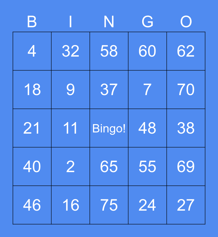 This bingo card has a free space and 24 words: 2, 16, 37, 46, 62, 4, 18, 32, 48, 65, 7, 21, 55, 69, 9, 24, 38, 58, 70, 11, 27, 40, 60 and 75.