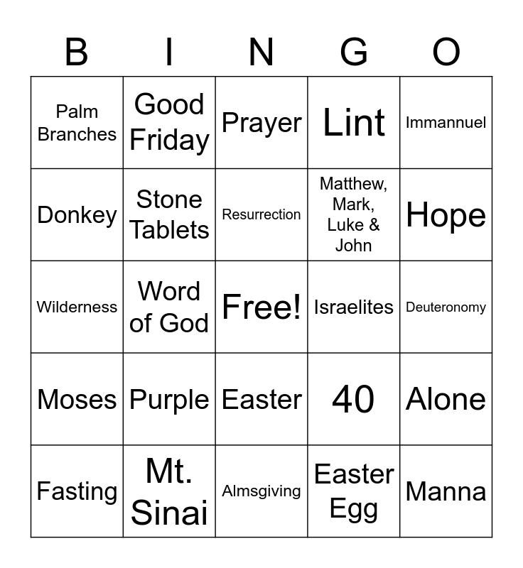 This bingo card has a free space and 24 words: Purple, Mt. Sinai, Resurrection, Fasting, Immannuel, Palm Branches, Donkey, Good Friday, Israelites, Easter, Matthew, Mark, Luke & John, Wilderness, 40, Alone, Stone Tablets, Easter Egg, Deuteronomy, Prayer, Hope, Word of God, Manna, Moses, Lint and Almsgiving.