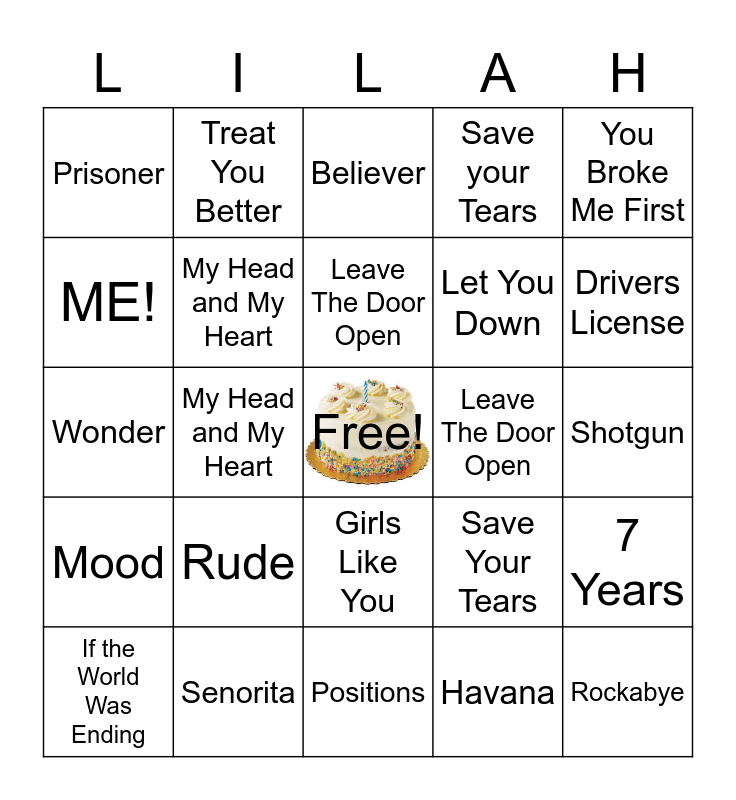 This bingo card has a free space and 36 words: Dance Monkey, You Broke Me First, Diamonds, My Head and My Heart, Save Your Tears, Mood, Leave The Door Open, Dance Monkey, You Broke Me First, Diamonds, My Head and My Heart, Save your Tears, Mood, Leave The Door Open, Drivers License, Prisoner, We're Good, Rude, Rockabye, Believer, Shotgun, 7 Years, Senorita, If the World Was Ending, Positions, Treat You Better, Wonder, Love Story, Let You Down, ME!, I'm Yours, Little Talks, Havana, Girls Like You, Party In The U.S.A. and Hava Nagila.