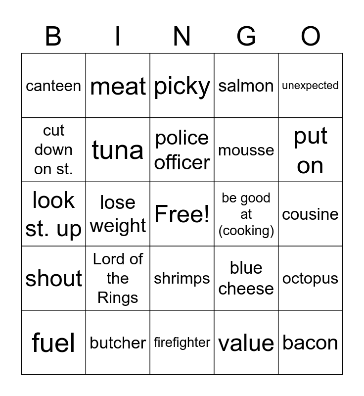 This bingo card has a free space and 25 words: Lord of the Rings, firefighter, police officer, fuel, unexpected, canteen, cut down on st., meat, be good at (cooking), shrimps, mousse, look st. up, blue cheese, octopus, tuna, steam, cousine, picky, put on, lose weight, bacon, butcher, shout, salmon and value.