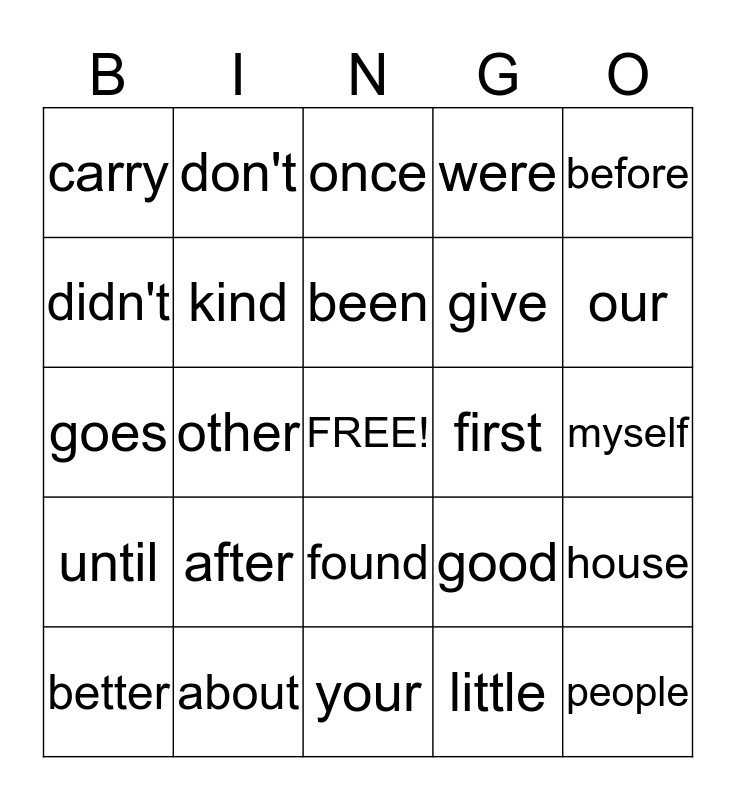 This bingo card has a free space and 24 words: after, about, been, better, before, carry, didn't, don't, first, found, give, goes, good, house, kind, little, myself, once, our, other, people, until, were and your.