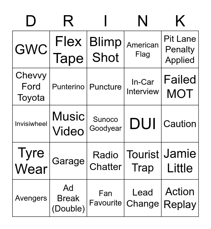 This bingo card has a free space and 24 words: Garage, Ad Break (Double), Puncture, Avengers, Pit Lane Penalty Applied, GWC, Chevvy Ford Toyota, Flex Tape, DUI, Radio Chatter, In-Car Interview, Invisiwheel, Tourist Trap, Jamie Little, Punterino, Lead Change, Caution, Blimp Shot, Failed MOT, Music Video, Action Replay, Tyre Wear, American Flag and Fan Favourite.