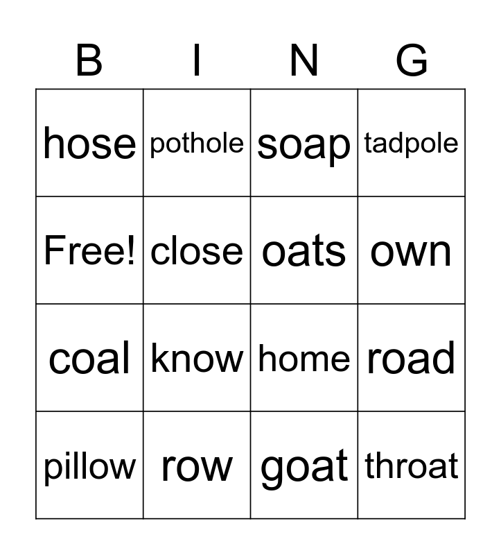 This bingo card has 16 words: row, road, soap, hose, coal, pothole, home, goat, Free!, close, pillow, tadpole, know, own, oats and throat.
