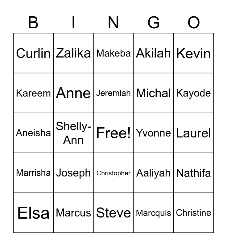 This bingo card has a free space and 29 words: Elsa, Terry, Shelly-Ann, Rosetta, Curlin, Makeba, Anne, Joseph, Yvonne, Marcus, Laurel, Christine, Steve, Marcquis, Kayode, Natasha, Christopher, Marrisha, Kevin, Aneisha, Aaliyah, Stephen, Michal, Kareem, Akilah, Zalika, Nathifa, Jeremiah and Zakai.